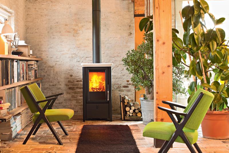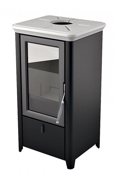 Poêle à bois forme traditionnelle, poignée à ressort, côtés en métal, dessus en céramique couleur White, Bordeaux, Warm Grey ou Black.